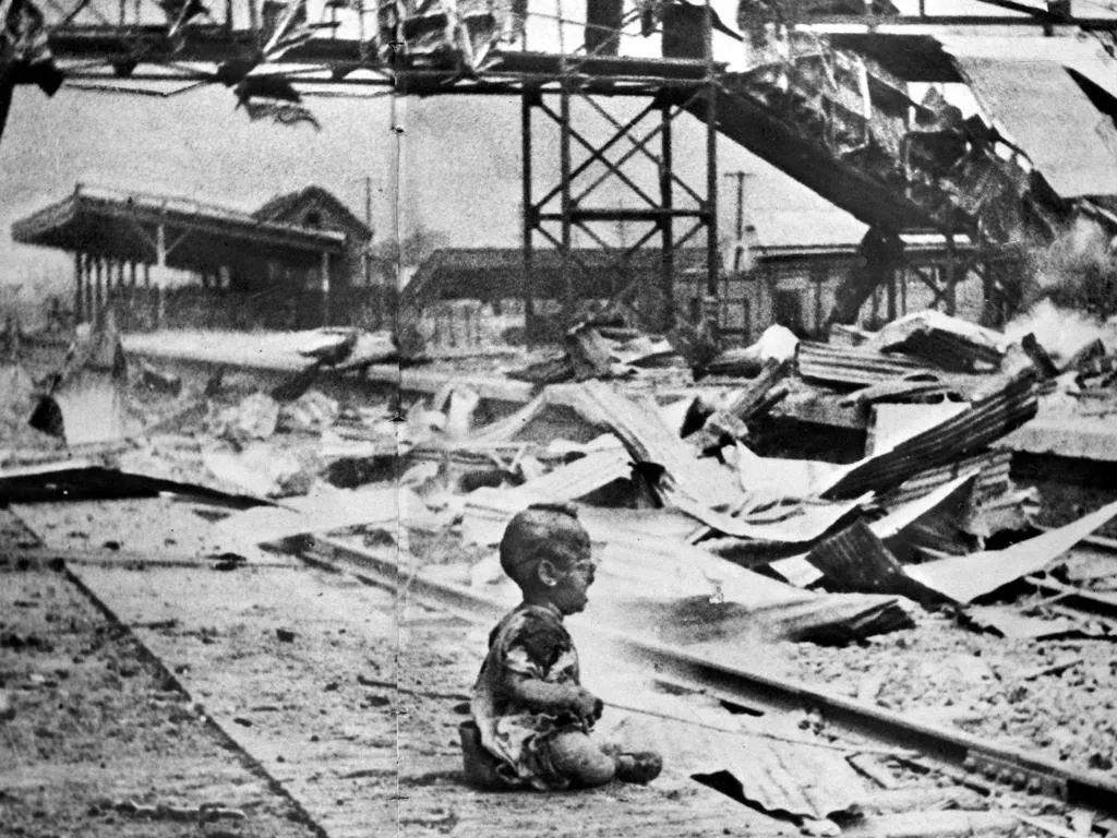 △淞滬會戰(zhàn),幼兒在被日軍轟炸后的斷壁殘垣中大哭。