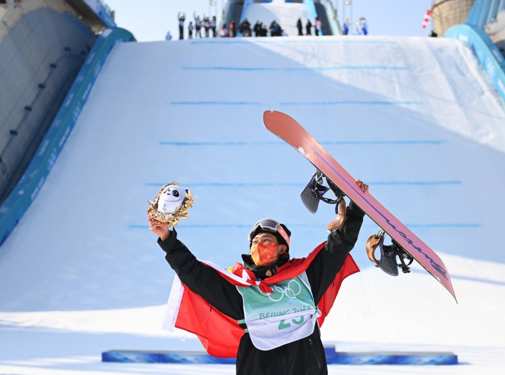 這是2022年2月15日,中國選手蘇翊鳴在北京2022年冬奧會單板滑雪男子大跳臺決賽奪冠后慶祝。