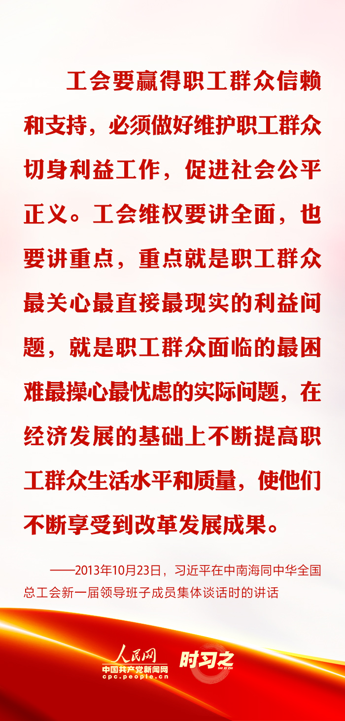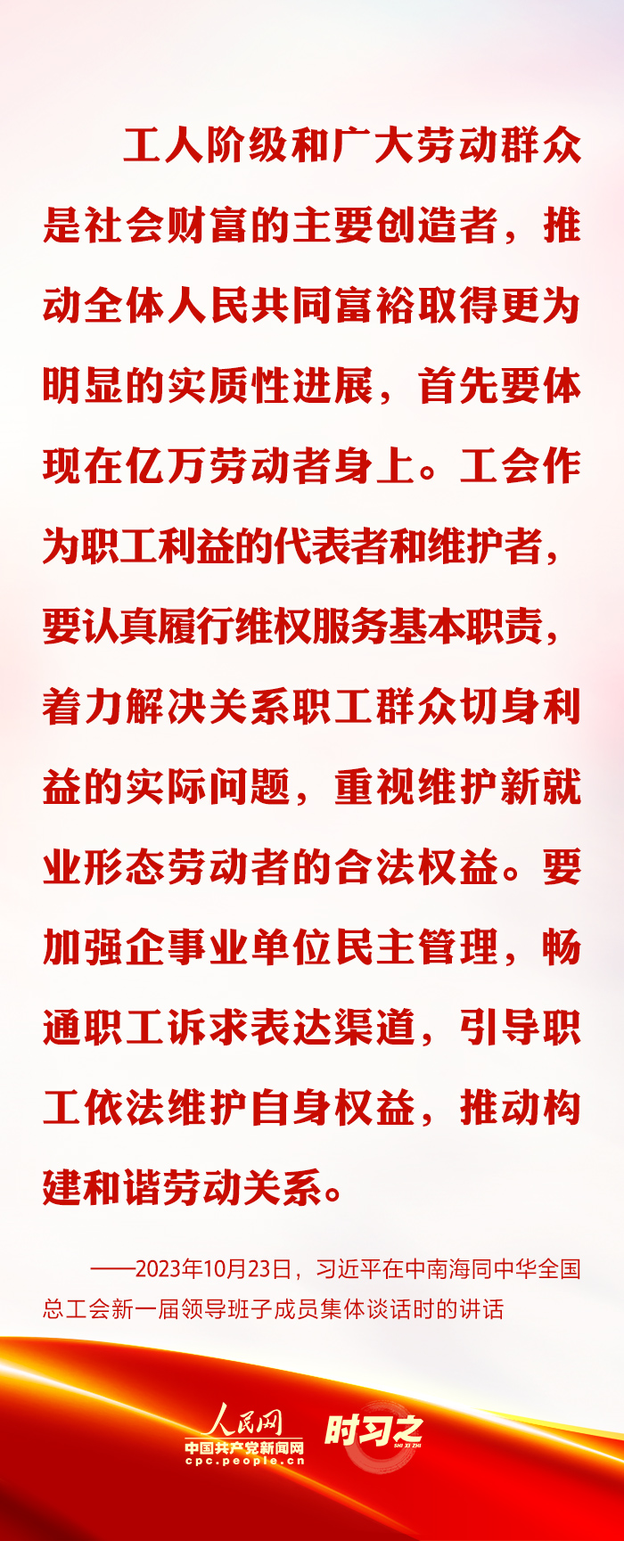 2023年10月23日下午,習(xí)近平總書記在中南海同中華全國總工會新一屆領(lǐng)導(dǎo)班子成員集體談話并發(fā)表重要講話。他強(qiáng)調(diào),工會作為職工利益的代表者和維護(hù)者,要認(rèn)真履行維權(quán)服務(wù)基本職責(zé),著力解決關(guān)系職工群眾切身利益的實際問題,重視維護(hù)新就業(yè)形態(tài)勞動者的合法權(quán)益。