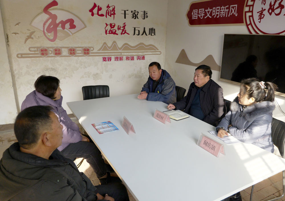 在寶豐縣鬧店鎮(zhèn)范營村“擺理堂”,村鎮(zhèn)干部(右)為村民進行信訪調(diào)解(2023年12月20日攝)。河南省寶豐縣積極推進四下基層工作深入開展,已打造鬧店鎮(zhèn)范營村“擺理堂”、石橋鎮(zhèn)東大莊村“老娘舅茶室”等系列鄉(xiāng)村社區(qū)服務(wù)陣地,協(xié)調(diào)鄰里關(guān)系,有效化解各類矛盾,同時不斷豐富工作內(nèi)容,拓展服務(wù)功能,助力鄉(xiāng)村振興。