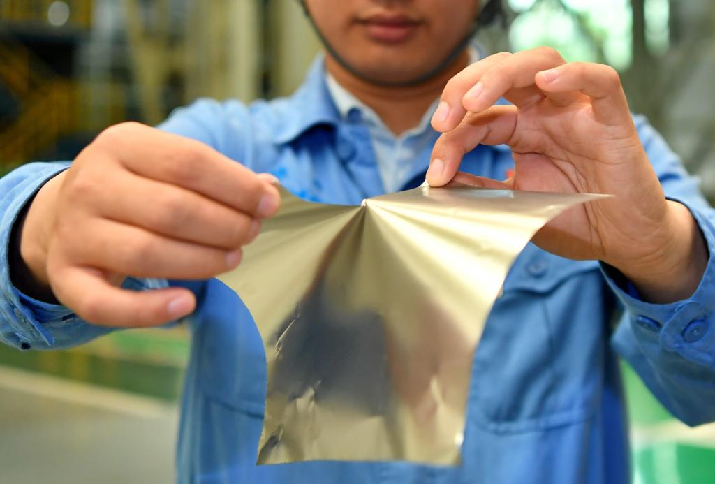 在位于山西的太鋼集團(tuán),員工展示用手撕開(kāi)0.02毫米厚的超薄帶狀不銹鋼(2019年5月24日攝)。